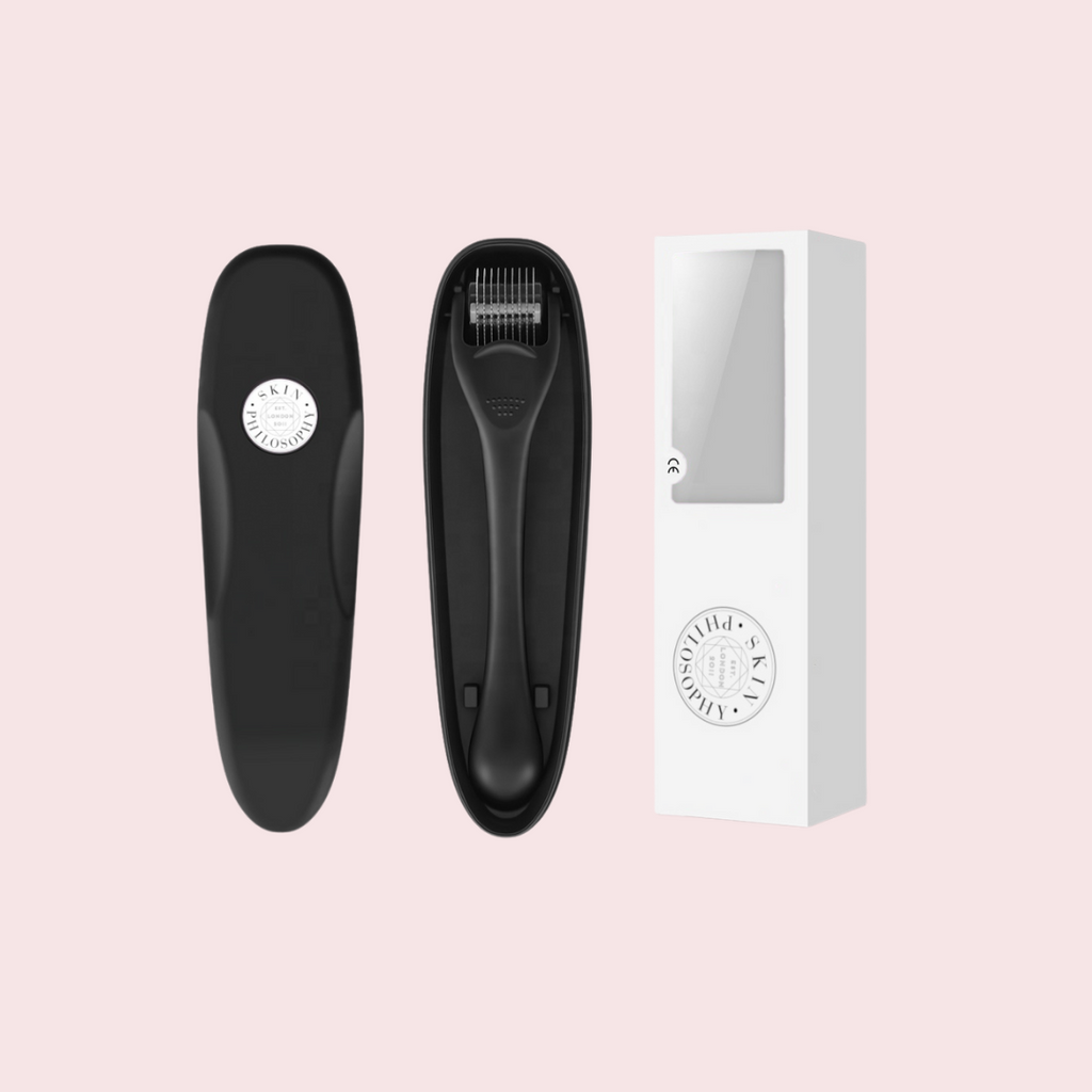 Skin roller is the ultimate at home skincare device. Our Skin Philosophy Skin Roller roller is at gentle depth of 0.25mm . This is important as it allows your product to penetrate the skin and stimulate circulation without creating trauma to the skin. A few minutes of Skin roller, 2-3 times a week, will help plump out fine lines and leave your skin glowing. The rubberized handle is nonslip with wet hands